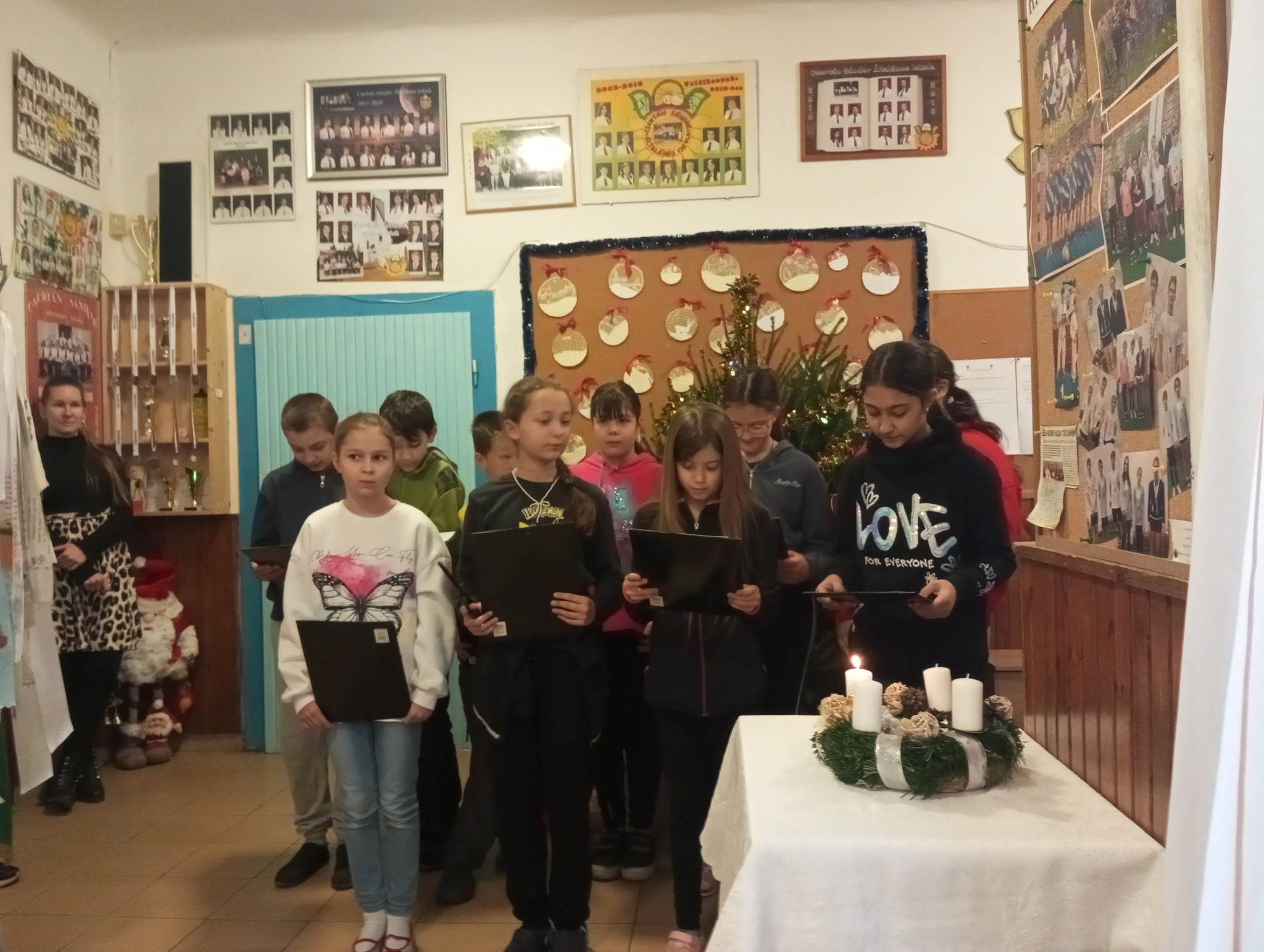 A gyerekek lelkesen díszítik osztályaikat, s az iskola környezete, folyosója is már karácsonyi hangulatban.