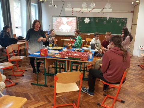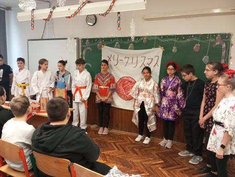 A gyerekek rendkívül élvezetes formában mutatták be az osztrák (5.o) a japán (6.o.) az olasz (7.o) és a spanyol (8.o.) karácsonyi szokásokat. A bemutatók után felkeresték egymás osztályait és megvendégelték egymást az országokra jellemző finomságokkal.