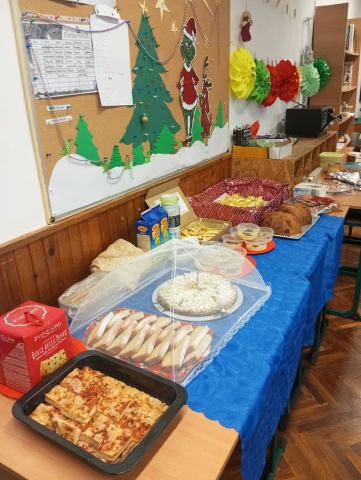 Az ötödikeseknél nem hiányozhatott a Stollen és a puncs, a hatodikosoknál a japán hagyományoknak megfelelően KFC finomságokat is kóstolhattunk, a hetedikeseknél helyben készült az isteni pizza, és naná, hogy a Panettone se maradhatott ki.